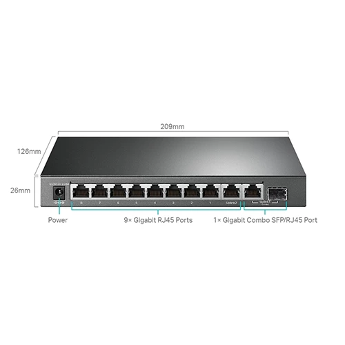 9× gigabit RJ45 ports and 1× combo gigabit SFP/RJ45 port