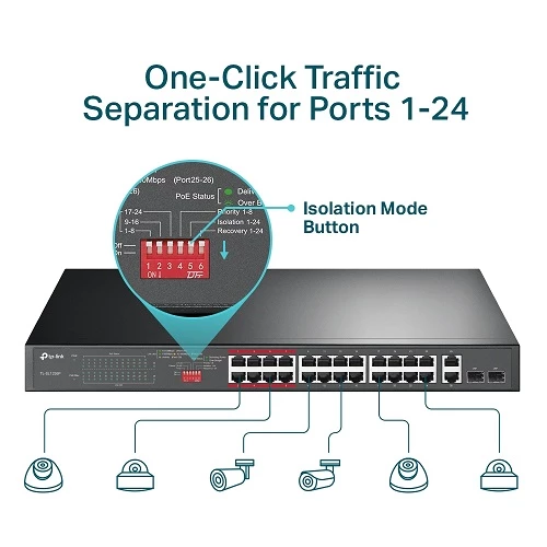 24× PoE+ 10/100 Mbps | High PoE power | Up to 250 m data and power PoE transmission range | Isolation Mode